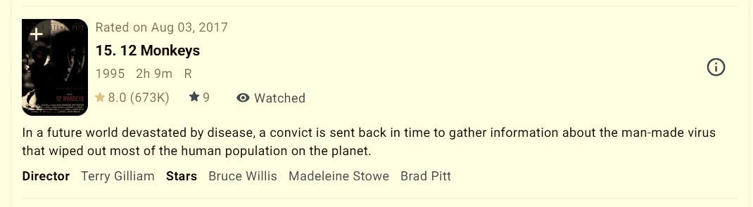1. I created my IMDb account in 2013, but until 2017 I didn’t use it much—dial-up sang its terrible song, and it cost more. Read my early internet experiences here.