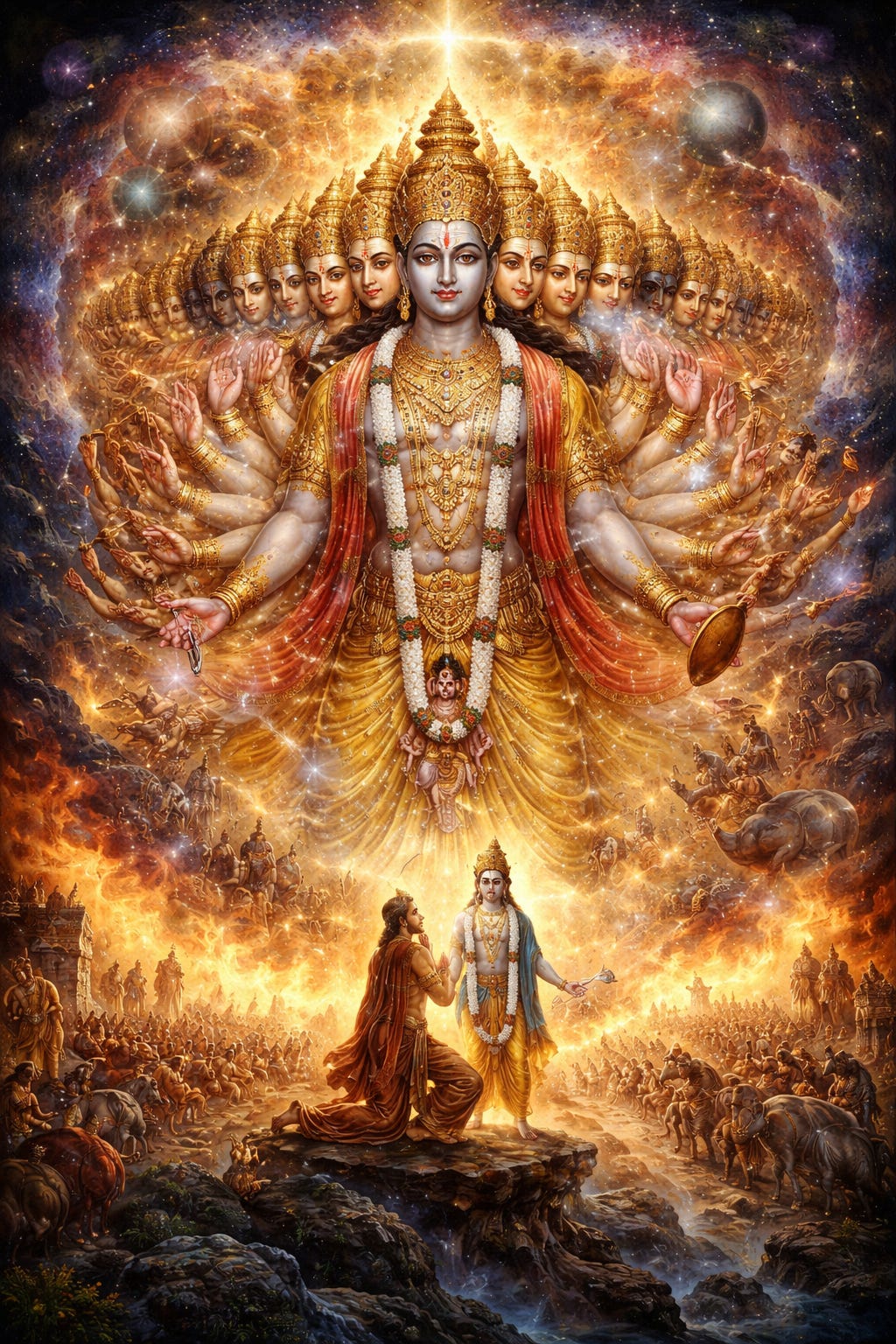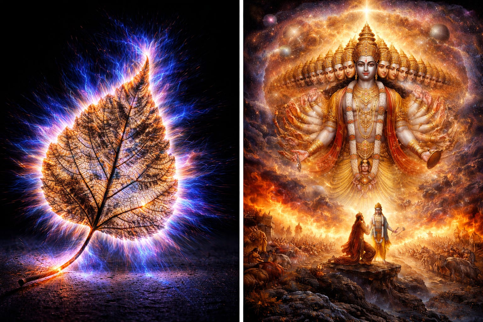 I want to dedicate a few paragraphs to the events of the Bhagavad Gita. Right before the battle of Kurukshetra, Krishna revealed his Virat Rupa — the Universal Form — to Arjuna. He showed that he is the entire universe itself. Arjuna saw the sun, stars, all gods, and even past and future moving inside Krishna. The Bhagavad Gita (11.12) describes the brightness as resembling hundreds of thousands of suns rising at once. This aura behind his head — the aura behind great sages — has been transcribed into many literatures throughout Eastern and Western philosophy. In India, the halo (Prabhamandala for the head, Prabhavali for the full body) may date back to the second half of the second millennium BC — figures on pottery from Daimabad’s Malwa phase (1600–1400 BC) already show halos around what appear to be sacred figures. This predates similar iconography in Christianity and possibly even Buddhism, which Kirlian later tried to prove through his photography. Now even science has proven that bioelectricity can be produced by the human body and other objects. Every time I recite those verses from the Gita, I feel that sensation in my body. The ancient Hindu artists were essentially depicting bioelectric and photonic fields around enlightened beings thousands of years before Kirlian invented his camera. This halo of Krishna at Kurukshetra is one of the most cited phenomena in Western philosophy.